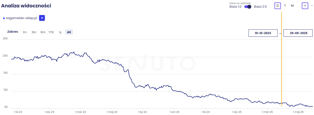 Sklep internetowy sagameble-sklep.pl przez ponad rok zmagał się z pogłębiającym się spadkiem widoczności organicznej. Od października 2023 roku strona straciła 138 fraz z TOP 3 (–72%) i 623 frazy z TOP 10 (–64%). Ruch malał, a średnia pozycja i liczba kliknięć notowały tendencję zniżkową.
